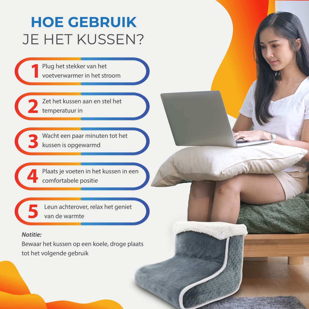Verban koude voeten voorgoed met onze voetenwarmer! Creëer het ultieme comfort in huis, zelfs op de koudste dagen of na een stressvolle dag. Met eenvoudige bediening via de meegeleverde afstandsbediening, geniet je van 6 verschillende temperaturen (40°C tot 60°C) en kies je uit vier tijdsinstellingen (2/4/6/8 uur). Verwen jezelf met warmte en ontspanning, altijd binnen handbereik!